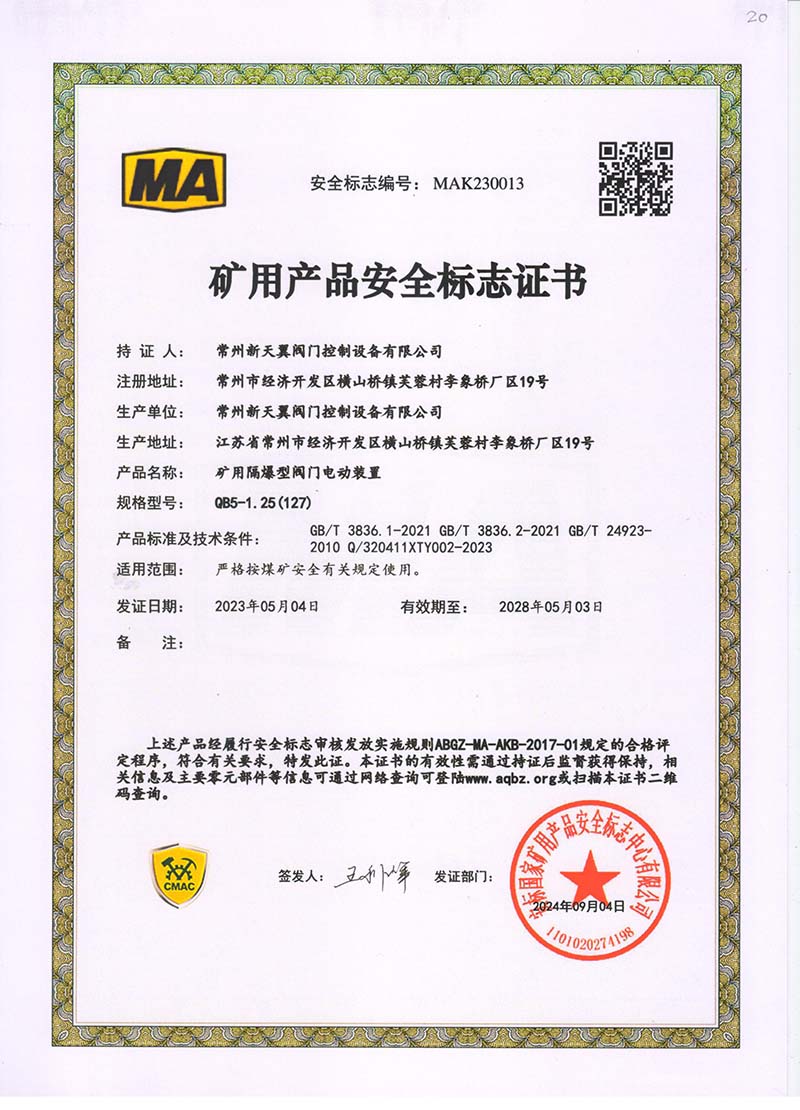 礦用產品安全標志證書QB20-1(380)