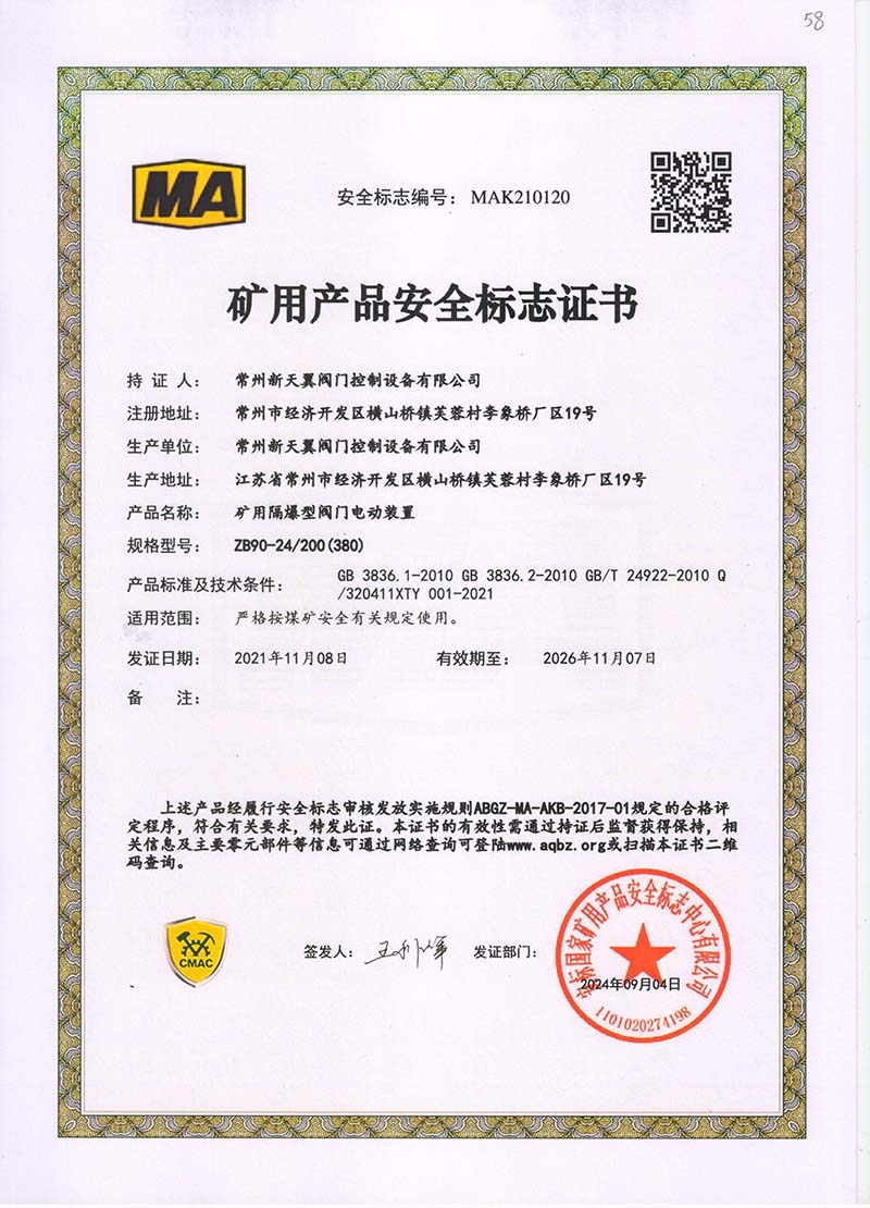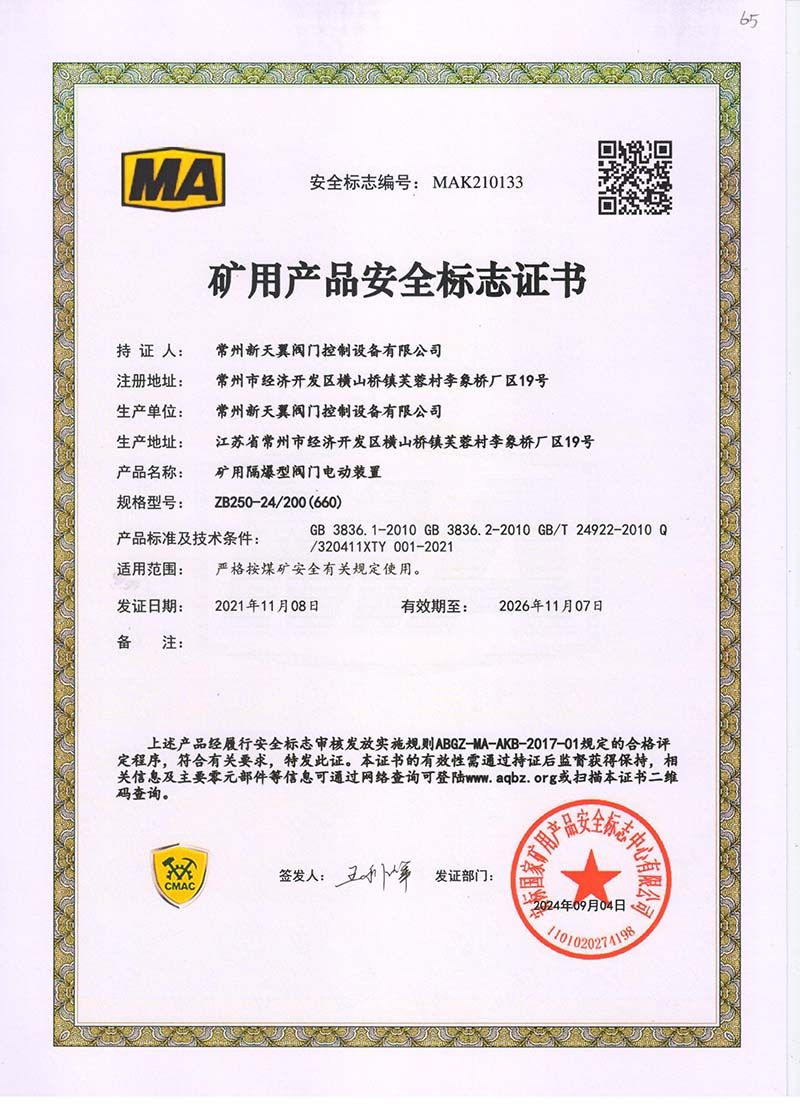 礦用產品安全標志證書ZB30-24 200(660)