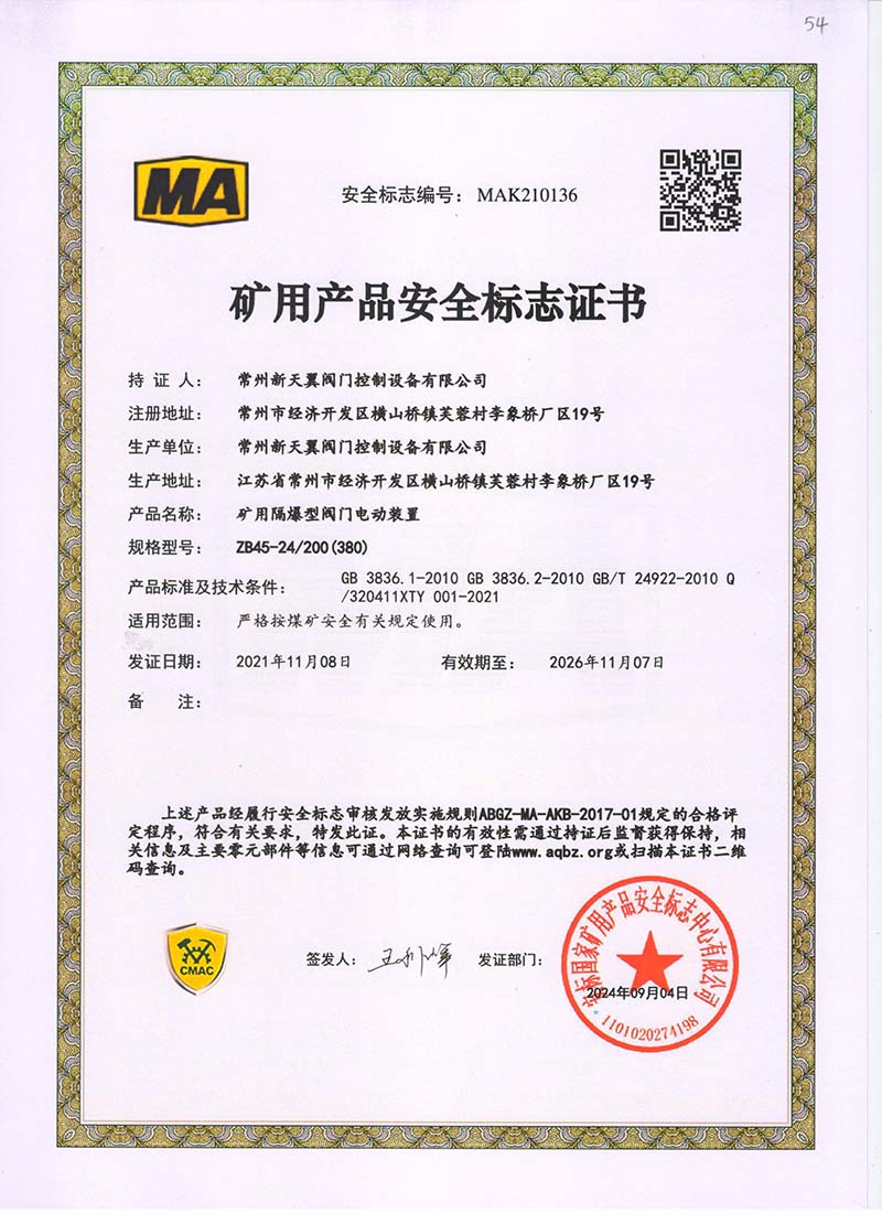 礦用產品安全標志證書ZJK180-24(380)